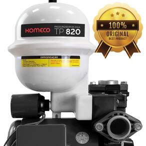 Mantém a rede pressurizada enquanto o ponto de consumo está aberto e após fechar o ponto de consumo.Ideal para rede de água de baixa pressão, destinando o fluxo de água para máquinas, aquecedores, bombeamento de poços, reservatórios e abastecimento de caixas d'água.Possui acionamento automático, mantendo a rede sempre pressurizada, além de protetor térmico contra sobrecargas.Conta com sensor de temperatura máxima de água de 60ºc, com sucção de até 7 m.C.A.Fabricado em plástico de engenharia 100% abs, evitando a oxidação.Características técnicasproduto: pressurizador para sistema hidráulico bivolt tp 820 g3 komecopotência: 1/4 180w marca: komecotensão v : bivolt 110 / 220v modelo: komeco-tp820corrente a : 1,6 / 3,2rotação r.P.M : 3500chave de pressão m.C.A. kpa liga: 12 120 chave de pressão m.C.A. kpa desliga: 24 240 pressão de funcionamento máximo: 34 mcapressão de sucção: 7 mcavazão máxima l/min : 35vazão mínima de trabalho l/min : 4vazão com 15 m.C.A. l/min : 20acionamento: fluxostato e cuba de pressãoconexões: 3/4 poltipo de embalagem: caixaaltura da embalagem: 450 mmlargura da embalagem: 240 mmprofundidade da embalagem: 200 mmpeso do produto na embalagem: 8 kgdimensões: axlxp mm - 160 x 155 x 182peso: 4,8 kgaplicação e uso- para pressurizar aquecedores de água a gás de até 33 litros/minuto.- acionamento automático, mantendo a rede sempre pressurizada.Dúvidas frequentes:- qual a bitola de entrada e saídaR: entrada/saída 3/4.- essa bomba é bivoltR: sim, bivolt 127v/220v .- tem pressostatoR: sim, conta com um pressostato que monitora e desliga o equipamento caso subpressão ou sobrepressão.- quais são as medidasR: altura: 16,5cm largura 42cm profundidade 21cm.- qual a pressão máximaR: pressão máxima é de 34 m.C.A.- dá para usar com água quenteR: a tp 820 g3 suporta temperaturas de até 60ºc.Carrapeta, aqui tem qualidade