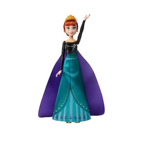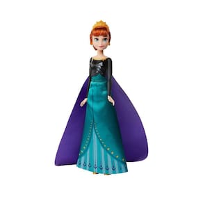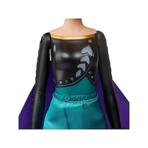 Música e luzes: Levante o braço para ouvir a boneca Anna tocar um trecho de 'Some Things Never Change' do filme Frozen 2 . A boneca da moda Anna usa um vestido inspirado em filme verde e preto removível, uma capa roxa, tiara e um par de sapatos
