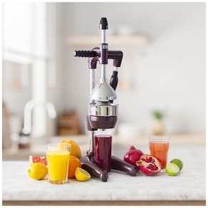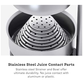 Espremedor manual de citrinos profissional Tribest MJP 105 XL, com tigela e peneira de aço inoxidável, alça ergonômica, copo de gotejamento e peças com travamento de segurança.Motor c/ dupla rotação