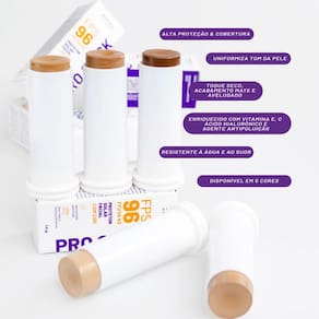 Principais Benefícios do Pro Stick Protetor Solar Multifuncional Proteção solar extrema: Com FPS 96 e FPUVA 43, oferece proteção prolongada contra os raios UVB e UVA.Resistente à água e suor: Ideal para atividades físicas e dias quentes, sem escorrer ou arder os olhos.Acabamento aveludado: Textura seca e confortável, que uniformiza o tom da pele sem necessidade de base.Vitamina C e E: Potentes antioxidantes que combatem os radicais livres, previnem o envelhecimento e promovem hidratação.Phytovie Defense: Óleo de canola que forma uma barreira protetora contra a poluição e raios solares, prevenindo manchas e danos à pele.PrimalHyal Gold: Ácido hialurônico que hidrata profundamente a pele e previne a perda de água.Pigmento de barreira física: Auxilia na proteção contra raios solares e luz azul, prevenindo e tratando manchas, como o melasma. Como Usar o Pro Stick Protetor Solar FPS 96 FPUVA 43Aplique o Pro Stick diretamente sobre a pele limpa e seca, deslizando o bastão uniformemente nas áreas expostas ao sol. Reaplique conforme necessário, especialmente após nadar ou suar excessivamente, para garantir proteção contínua.