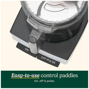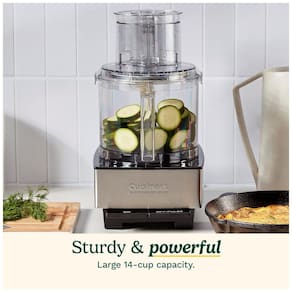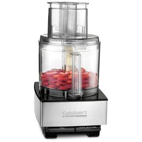 Processador de alimentos Cuisinart com potência de 720 Watts, tigela de 14 xícaras, disco de fatiar em aço inoxidável, disco de trituração e lâmina de corte. Inclui espátula e livro de receitas.Acessórios