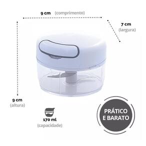 Processador 170 ml Cortador De Alimentos Multiuso Corda Mimo Cortador Multiuso com Recipiente Produto com design moderno, compacto e ergonômico, é preciso apenas cortar a cebola em quatro partes e deixar que o cortador termina o serviço ao ser girado para esquerda e direita repetidamente. É o fim de cheiros nas mãos e lágrimas causadas pelas cebolas e alhos. Então pare de sofrer e leve essa tendência para seu lar.