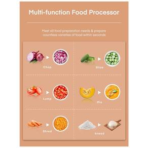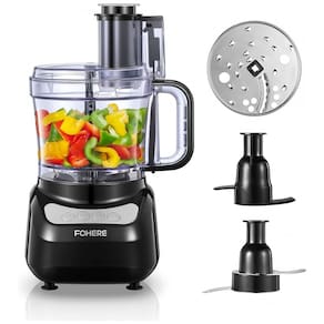 Processador de alimentos com capacidade de 12 xícaras, 4 velocidades, acessórios multifuncionais para cortar, misturar, fatiar e ralar. Inclui lâminas intercambiáveis e peças laváveis na lava-louças.Acessórios