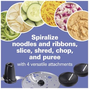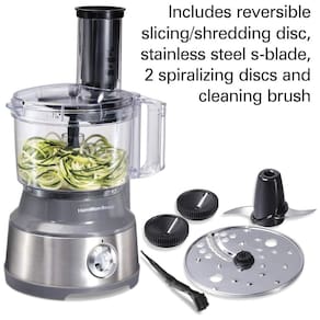 Faça espirais e fitas vegetarianas perfeitas com as lâminas de espiral e fita. O aço inoxidável S blade corta, mistura e faz purês e o disco de aço inoxidável fatia e pica. Você economizará tempo e reduzirá a necessidade de pré cortar toda vez que usar este processador de alimentos de 10 xícaras, porque pode encaixar alimentos inteiros, como abobrinha ou bloco de queijo a calha de alimentação. O motor de 450 watts oferece muita potência para processar todos os tipos de ingredientes e o seletor de 2 velocidades, pulso fornece todo o controle que você precisa para espiralizar, cortar, fatiar e triturar. Você poderá processar 10 xícaras de comida sem ter que parar para esvaziar a tigela. Como a tigela tem um bico, você pode transferir molhos, molhos e purês para recipientes de servir ou de zenamento sem fazer bagunça. Neste processador de alimentos Hamilton Beach, todas as peças removíveis, incluindo a escova de limpeza, podem ser lavadas na máquina de lavar louça para uma limpeza sem esforço e todas as zonas de alimentos são livres de BPA para maior tranquilidade