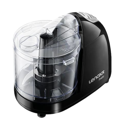 Possui uma lâmina dupla de aço inoxidável que ajuda a triturar melhor e mais rápido com facilidade sem sujar as mãos, pois basta travar a vasilha e a tampa e apertar o botão na parte superior para iniciar o processamento de alimentos.