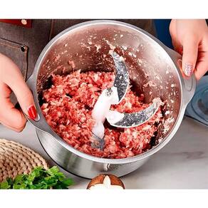 Processador de alimentos em aço inoxidável com capacidade de 5 litros. Ideal para triturar legumes, frutas, verduras, carnes e outros alimentos em pequenos pedaços. Possui lâminas em aço inoxidável, motor potente e silencioso, e duas velocidades.Acessórios