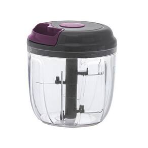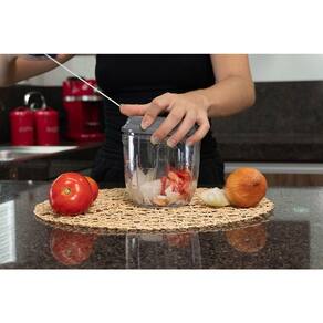 Coloque a lâmina no ponto central do recipiente, adicione os ingredientes, tampe e gire para a esquerda para travar. Puxe a corda para girar a lâmina, quanto mais puxar, mais triturado os alimentos ficam.