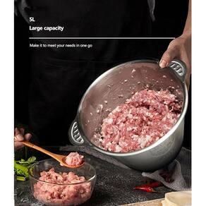 Processador triturador de alimentos em aço inoxidável com capacidade de 5 litros. Ideal para triturar legumes, frutas, verduras e carnes. Possui lâminas em aço inoxidável e motor potente e silencioso. Conta com 2 velocidades.Acessórios