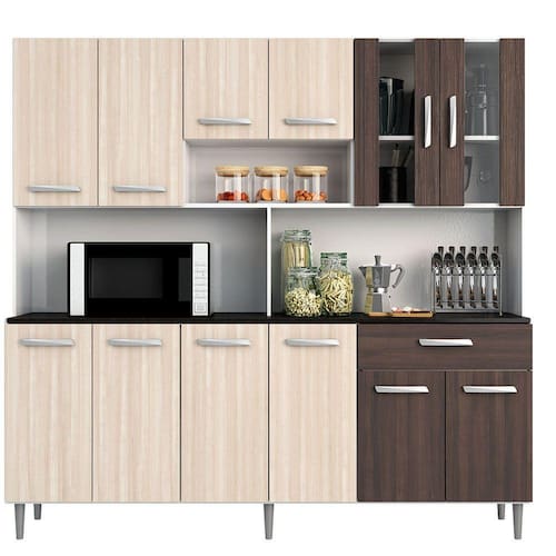 O Kit Cozinha Compacta Clara 12 Portas Branco/Rovere/Amêndoa é uma cozinha compacta e completa para você deixar o seu ambiente mais organizado e bonito. Sua estrutura é feita em MDP de 12 e 15 mm, pintura UV que dá maior durabilidade ao móvel, puxadores com a pintura cromada, portas com dobradiças metálicas, sendo duas com vidro temperado, gaveta com corrediças metálicas, espaço para microondas ou outros utensílios, nicho organizador decorativo e amplo espaço interno, confira esse encanto e deixe sua cozinha mais prática e moderna!