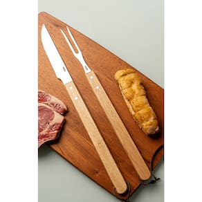 As lâminas são fabricadas em aço inoxidável de alta qualidade, garantindo resistência à corrosão e durabilidade a longo prazo. A faca possui um corte afiado e preciso, enquanto o garfo oferece estabilidade para segurar e manusear as carnes, facilitando o processo de servir.