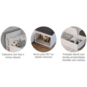 E mais, esse móvel ainda conta com cabeceira com baú e nichos laterais, gavetão com rodízios, estrado em compensado multilaminado, acabamento em pintura UV e capacidade para suportar até 100kg muito bem distribuídos.