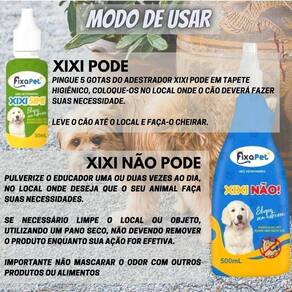 Produto para condicionar comportamento de urina 500 ML Bem-vindo a Empresa PET ESTILOSO Kit Pet Educador Sanitário Cão Adestrador Xixi Não Pode 500 ml não pode e 30 ml pode Produto: Kit Pet Educador Sanitário Cão Adestrador Xixi Não Pode O Educador Sanitário foi desenvolvido para auxiliar no treinamento sanitário do seu animal. - O Xixi Não Pode, ajuda a manter distância dos objetos e locais que não devem fazer o xixi podendo ser utilizados em locais internos e externos . - O Xixi Pode é indicado para sinalizar e adestrar o local onde deve fazer o xixi. --- Kit composto por: --- - 01 educador sanitário Xixi Pode 30ml . - 01 educador sanitário Xixi Não Pode 500ml . - Composição: Mentil nonil cetona, essência, veículo .S.P. - Indicado para Cães XIXI NÃO PODE Modo de Usar: Ambientes internos e objetos: Pulverizar o educador NÃO PODE uma ou duas vezes ao dia, no local onde não se deseja que o seu animal faça suas necessidades. Se necessário limpe o local ou objeto, utilizando um pano seco, não devendo remover o produto enquanto a sua ação for efetiva. É importante não mascarar o odor com outros produtos ou alimentos. Nota: o animal deverá ser treinado todos os dias. XIXI PODE Pingue 5 gotas do adestrador Xixi Pode em tapete higiênico, coloque-os no local onde o cão deverá fazer suas necessidade. Leve o cão até o local e faça-o cheirar. ADVERTENCIA: - Conservar em local seco e fresco, ao abrigo da luz solar. - Manter fora do alcance de crianças e animais domésticos. - Não guarde ou aplique perto de alimentos, bebidas e medicamentos. - Em caso de contato com os olhos, lavar com água por 15 minutos. - Em caso de ingestão, procure imediatamente o Ceatox - Centro de Auxilio Toxicológico - 08000-148110 ou o serviço de saúde mais próximo, levando a embalagem ou rótulo do produto. - Produto declarado isento de registro conforme instrução normativa Nº 37 do Mapa Marca: Não Informado