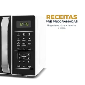 Com 1100W de potência, você aquece e prepara alimentos com rapidez. A função +30 segundos garante aquele toque extra de calor com apenas um botão, enquanto as receitas pré-programadas como pizza, lasanha, pipoca e brigadeiro tornam o dia a dia mais saboroso.