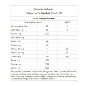 Prohibido fuel pré-treino drink 473ml a fórmula do prohibido fuel foi desenvolvida para impulsionar sua qualidade de vida. seu corpo é uma máquina incrível que, para funcionar em seu melhor, precisa dos nutrientes certos em combinações eficazes. É exatamente essa sinergia perfeita de ingredientes que o prohibido fuel oferece ao seu organismo. o prohibido fuel contém ingredientes poderosos como i- arginina, beta-alanina, i-tirosina, vitaminas b3 e b6, cromo, i- taurina e creatina. benefícios: - 2.000mg de beta alanina;- 3.000mg de arginina;- 1.000mg de taurina;- 500mg de alanina;- 200mg de cafeína;- creatina e palatinose;- fonte de vitaminas;- sabores incrivelmente prazerosos em beber;- melhora o foco e o tempo de velocidade de resposta;- acelera o metabolismo e aumenta a energia;- prático em transportar independente do dia-a-dia, de treino e exercícios.
