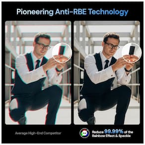 Recursos e tecnologias: Projetor com fonte de luz a laser RGB (cerca de 3.000–3.500 lumens ISO), resolução 4K 3840 x 2160, gama aproximada de 110% Rec.2020, motor NoirScene com contraste dinâmico e iris, mapeamento de tom dinâmico, Anti-Rainbow Effect, relação de projeção em torno de 0,9–1,5:1, deslocamento de lente vertical, modos de baixa latência para jogos, Google TV, Wi-Fi 6E, rede gigabit, decodificação Dolby Atmos e DTS; base Desktop Gimbal Stand com suporte a até 10 kg, estrutura em liga de alumínio, apoio de dupla articulação, ajuste de 360° horizontal e vertical, pads em silicone para proteção e aderência