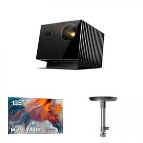 Recursos e tecnologias: Projetor com fonte de luz a laser RGB (~3.500 lumens ISO), resolução 4K 3840 x 2160, cobertura aproximada de 110% Rec.2020, motor NoirScene Dark Field Engine, contraste dinâmico até 50.000:1, iris dinâmica, mapeamento de tom dinâmico, Anti-Rainbow Effect, relação de projeção 0,9–1,5:1, deslocamento de lente vertical, modos de baixa latência para jogos, Google TV integrado, Wi-Fi 6E, rede gigabit, suporte a Dolby Atmos e DTS; tela fixa 135" com ganho 1,3, PVC de alta qualidade, ângulo de meia-ganho próximo de 170°, superfície tensionada, compatível com 4K/8K; suporte de teto em alumínio com capacidade até 10 kg, altura ajustável 31–40,5 cm (12 cm sem extensão), rotação 360°, inclinação de cerca de 20°, engate rápido e passagem interna de cabos