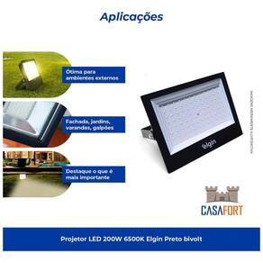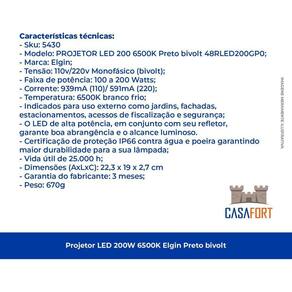 - Marca: Elgin - Potência: 200W - Tensão: 110-220V - Frequência: 50/60hz - Fluxo luminoso: 16000lm - Vida útil L70 : 25.000h - Índice de proteção: IP66 - Dimensões: 2,7 x 22,3 x 19 cm - Peso: 670G -garantia do Fabricante: 3 meses