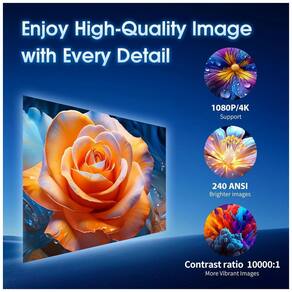 Equipado com WiFi 6 dual-band e Bluetooth 5.2 bidirecional para conexões rápidas e estáveis, permite pareamento com caixas, fones ou uso do celular como alto-falante, complementado por speaker HiFi interno. Tecnologia LCD com HDR para contraste e cores aprimorados, correção automática de keystone, rotação 180°, foco manual por roda e zoom digital 35%-100%.