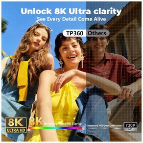 O Trunera TP360 é um projetor mini portátil com resolução nativa 1280x720 e suporte a 1080P/4K/8K decoding, equipado com Android 14 OS para acesso direto a apps de streaming, adequado para entretenimento em quarto, home cinema e uso doméstico interno/externo. Possui suporte rotativo 270° para projeção em paredes ou tetos, razão de throw curta 0.8:1 e zoom 50%-100% para telas grandes em espaços pequenos.