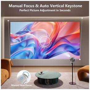Suporta tamanhos de projeção de 76 cm a 330 cm (30 a 130 polegadas) em distâncias de 0,6 m a 2,5 m, compatível com consoles de jogos, laptops, smartphones e speakers via HDMI, USB e screen casting. Indicado para apartamentos e quartos com espaço limitado, com montagem em mesa, tripé ou teto.