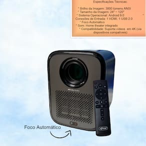 Brilho da Imagem: 3800 lúmens ANSI (para excelente visualização mesmo em ambientes com luz) Tamanho da Imagem: 24" ~ 120" Fonte de Luz: LED com vida útil de 30.000 horas Sistema Operacional: Android 9.0 Conexões de Entrada: 1 HDMI, 1 USB 2.0 Conexões de Saída: Mini Jack Som: Home theater integrado com áudio de alta qualidade Ruído de Funcionamento: 40dB em modo normal Controle Remoto: Incluso Compatibilidade: Suporta vídeos em 4K (via dispositivos compatíveis)