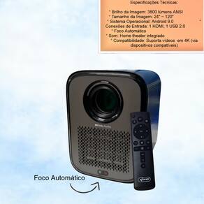 Brilho da Imagem: 3800 lúmens ANSI (para excelente visualização mesmo em ambientes com luz) Tamanho da Imagem: 24" ~ 120" Fonte de Luz: LED com vida útil de 30.000 horas Sistema Operacional: Android 9.0 Conexões de Entrada: 1 HDMI, 1 USB 2.0 Conexões de Saída: Mini Jack Som: Home theater integrado com áudio de alta qualidade Ruído de Funcionamento: 40dB em modo normal Controle Remoto: Incluso Compatibilidade: Suporta vídeos em 4K (via dispositivos compatíveis)