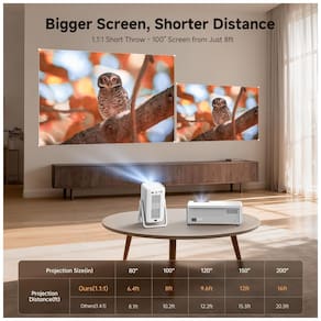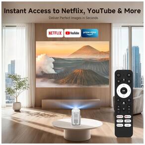 Com WiFi 6 e Bluetooth 5.4 bidirecional, suporta espelhamento de smartphones, laptops e consoles de jogos, além de áudio Dolby com alto-falantes estéreo DTS e eARC para conexão com sistemas externos. A distância de projeção varia de 1,15 a 5,35 m, ideal para espaços compactos como apartamentos, quartos ou cinema ao ar livre noturno. O sistema operacional recebe atualizações automáticas para compatibilidade contínua com plataformas de streaming.