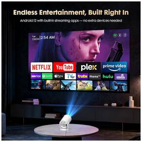 O WISHOLY Mini Projector é um projetor portátil LCD com sistema operacional Android 12 integrado e aplicativos nativos como YouTube, Prime Video e Hulu, permitindo streaming direto sem necessidade de TV stick ou laptop. Com resolução nativa Full HD 1920x1080 e suporte a 1080P, oferece projeção de imagens de 76 a 508 cm (30 a 200 polegadas), com foco elétrico e correção keystone vertical automática para configuração rápida. Seu suporte rotativo de 180° permite projeção em parede, teto, mesa ou tripé, adaptando-se a diferentes ambientes internos ou externos.