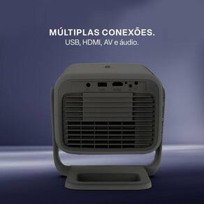 Portátil e Versátil: Com seu design compacto e elegante na cor preta, você pode levá-lo para qualquer lugar e projetar em diferentes superfícies, transformando qualquer parede em uma tela gigante.