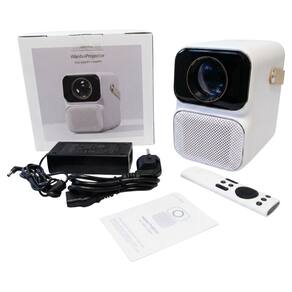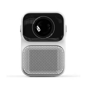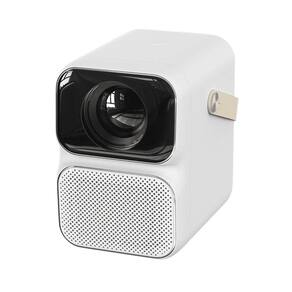Com um design minimalista e elegante na cor branca, o projetor possui uma alca de couro integrada que facilita o transporte para qualquer lugar. Sua construcao compacta e o sistema de correcao trapezoidal (Keystone) de 4 pontos permitem que ele seja posicionado em diferentes angulos, inclusive lateralmente, projetando uma tela retangular perfeita de 50 ate 200 polegadas, adaptando-se a qualquer espaco disponivel.