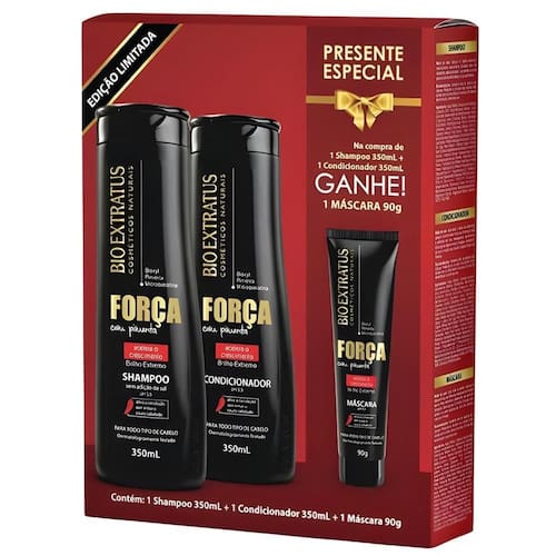 A Ísis Cosméticos é uma empresa que atua no ramo de produtos para beleza, cosméticos e cuidados pessoais. Nós da loja Ísis Cosméticos trabalhamos com as principais marcas do mercado, levando até você os melhores produtos e lhes oferecendo uma ótima experiência. Somos uma empresa que preza pela confiança e satisfação de nossos clientes. ========================================================================================= Promopack Bio Extratus Shampoo Condicionador + Máscara 90g Fórmula inovadora que combina a exclusiva tecnologia Bioxyl, a ação da pimenta e o poder reconstrutor da microqueratina, promovendo um tratamento intensivo de força e crescimento. O Shampoo Força com Pimenta realiza uma limpeza equilibrada, devolvendo brilho e vitalidade ao cabelo fraco. O tratamento com a Linha Bio Extratus Força com Pimenta acelera o crescimento e promove o fortalecimento dos fios. Ph 5,5. Sem adição de sal. Modo de usar: aplique no cabelo molhado, massageando suavemente. Enxágue bem. Se necessário, repita a aplicação. Use também os outros produtos da Linha Bio Extratus Força com Pimenta. O Condicionador Força com Pimenta confere um condicionamento imediato, devolvendo brilho e vitalidade ao cabelo fraco. O tratamento com a Linha Bio Extratus Força com Pimenta acelera o crescimento e promove o fortalecimento dos fios. Ph 3,5. Modo de usar: após lavar o cabelo com shampoo, aplique o Condicionador Força com Pimenta por toda a extensão dos fios, massageando suavemente. Deixe agir por alguns minutos. Enxágue. Use também os outros produtos da Linha Bio Extratus Força com Pimenta. A Máscara Força com Pimenta confere uma hidratação reconstrutora, devolvendo brilho e vitalidade ao cabelo fraco. O tratamento com a linha Bio Extratus Força com Pimenta acelera o crescimento e promove o fortalecimento dos fios. Ph 4,0. Modo de usar: após lavar o cabelo, aplique a Máscara Força com Pimenta, massageando mecha a mecha. Para intensificar o tratamento, use touca de hidratação. Deixe agir de 3 a 5 minutos. Enxágue. Use também os outros produtos da linha Bio Extratus Força com Pimenta. ========================================================================================= Anúncio composto por: 01 unid. Shampoo Bio Extratus Força com Pimenta 350mL 01 unid. Condicionador Bio Extratus Força com Pimenta 350mL 01 unid. Máscara Bio Extratus Força com Pimenta 90g SKU Interno: IS010183 Agradecemos a preferência. Marca: Não Informado