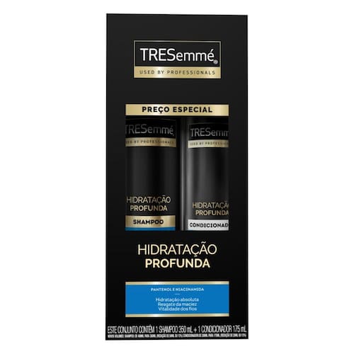 Promopack Shampoo e Condicionador Tresemmé Hidratação Profunda Promopack Shampoo e Condicionador Tresemmé Hidratação Profunda A linha TRESemmé Hidratação Profunda foi desenvolvido com Pantenol e Niacinamida, conhecidos por seus benefícios capilares, para um boost hidratante em todos os tipos de cabelos. A linha oferece: 1.Promove hidratação profunda do cabelo: com fórmula ultra-hidratante de alta , a linha entrega uma hidratação profunda, sem pesar os fios. 2.Restaura a maciez dos fios: a linha TRESemmé Hidratação Profunda é um tratamento de hidratação superior que restaura de forma eficaz e instantânea a maciez e toque suave das fibras. 3.Contém Pantenol e Niacinamida, conhecidos por seus diversos benefícios capilares: com a combinação exclusiva do pantenol e niacinamida com alta capilar a linha entrega o máximo poder hidratante. Experimente também a dupla imbatível que trata e finaliza seu cabelo: Trata: Máscara de tratamento TRESemmé Hidratação Profunda com fórmula desenvolvida com a Tecnologia Hydra-Resistance para garantir fios hidratados e macios. Finaliza: Creme de pentear leave-in TRESemmé Hidratação Profunda possui proteção contra os danos causados pelos raios UV e devolve imediatamente a hidratação e suavidade das fibras, sem pesar. Modo de Uso: Shampoo Tresemmé Hidratação Profunda 350ml Aplique o shampoo nos cabelos molhados, massageando o couro cabeludo suavemente. Enxágue bem. Condicionador Tresemmé Hidratação Profunda 175ml Aplique no comprimento dos cabelos, evitando a raiz. Deixe agir e enxague bem. Marca: Não Informado
