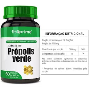 Extrato de própolis verde em pó, excipiente amido de milho e antiumectante dióxido de silício. Composição da cápsula: gelatina, água e umectante glicerina.