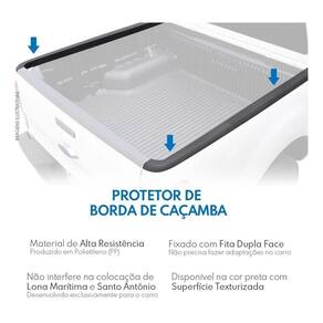 Fabricado em plástico polietileno, protege a borda da caçamba contra pequenas batidas, riscos ou manchas. Produto de fácil instalação pois é fixado com cola dupla face da 3m,basta limpar bem o local onde será fixada a peça, Não impede em nada sua instalação junto com santo antonio ou capota marítima
