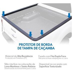 Protetor Borda Tampa E Laterais Gm S10 Cab. Dupla 96 Á 12 Preto Especifico Protetor de borda lateral de caçamba - 2 peças Protetor de tampa traseira de caçamba - 1 peça Aplicação: chevrolet s-10 Intalação : Instalado através de fita dupla face 3m. Conteúdo da embalagem: - 2 protetores de borda lateral - 1 protetor de borda da tampa traseira Especificações especificação técnica: - fabricado em polietileno pp - disponível na cor preta - fita dupla 3m - específico para o modelo do carro - garante proteção para a caçamba do carro - encaixe sob medida. - fixação nas bordas da caçamba. Fabricado em plástico polietileno, protege a borda da caçamba contra pequenas batidas, riscos ou manchas. Produto de fácil instalação pois é fixado com cola dupla face da 3m,basta limpar bem o local onde será fixada a peça, Não impede em nada sua instalação junto com santo antonio ou capota marítima Importante: de 6 meses direto com o fabricante não cobre mal uso ou erro de instalação. Valor unitário. Imagens meramente ilustrativas. Nosso horário de atendimento é de segunda a sexta das 9 as 17 horas exceto feriados . Boa compra... Atenção: as compras realizadas em nome de pessoa jurídica estão sujeitas à cobrança de icms, conforme protocolo icms 41, de 4 de abril de 2008. Caso você tenha dúvidas sobre o percentual a ser aplicado, consulte a cláusula segunda, 1 do referido protocolo. Marca: Não Informado