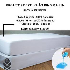 O protetor de colchão de malha king possui ação antimicrobiana contra fungos, ácaros e bactérias. É impermeável e impede a passagem de água, óleos e líquidos para o colchão, mantendo o limpo e com aparência de novo por muito mais tempo.Produzido em malha com tecnologia super impermeável e elásticos para envolver toda a lateral, o protetor de colchão de malha é ideal para quem quer proteger o colchão sem interferir na aparência da cama. Fácil e prático de usar, possui ajuste perfeito ao colchão e pode ser lavado em máquina.