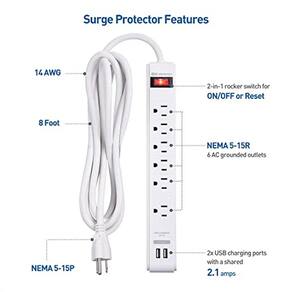 Conecte más con Cable Matters AC Potencia de productos 6 Salida Power Strip Transformar un enchufe eléctrico existente en una estación de mini-charging en la habitación recámara para cocina, oficina, o en la escuela. Dual USB Puertos de carga con una carga de dos 2,1 amperios compartida smartphones. El interruptor de encendido/apagado es apesível para una intégrant rápida o disjuntor de circuito Reset. Ele es montaje en pared o superficie con tiradores de rosca en la parte inferior de la surge protector. Puertos de carga USB Dual USB Puertos de carga con una 2,1 amperios compartida proporcionar con protección de picos de potencia para tus dispositivos electrónicos. Todos os dispositivos conectados estão protegidos con la supresión de sobretensiones de hasta 300 Julios. Especificaciones – Classificação Tetera: 15 A, 125 VAC, 60 Hz, 1875 W – julios Classificação: 300 – Sujeción Voltaje: 500 V – AC Potencia Longitud del cabo: 8 tortas Importantes notas Estimadas – sólo para uso en interiores en seco Ubicaciones – No exceda el índice de tetera Contenido del paquete 1 x 6-Outlet surge protector 1 x Plantilla de montaje en superficie Garantía Garantía limitada de un año y soporte producto