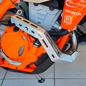 Fabricado em chapa de alumínio de 2mm, oferece resistência superior aos impactos e obstáculos do off-road, prolongando a vida útil da curva de escape da sua KTM mesmo nas trilhas mais exigentes. O design exclusivo, aliado à precisão do acabamento em alumínio escovado e pintura epóxi preta semi-brilho, não apenas protege, mas também valoriza o visual da sua moto com um toque esportivo e sofisticado.