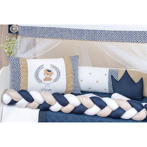 Protetor De Berço Menino Ursinho Ted Protetor ImpermeávelTotal 14 peças 1 edredom 130cm x 75cm1 cabeceira 0.60 x 0.40 1 lateral 1.28 x 0.251 trança 1.28 x 0.12 1 fronha 0,28 x 0,38 1 lençol de cima com bainha1 bando do mosqueteiro 1.40 x 0.20 1 mosqueteiro 4.50 x 1.50 1 almofada 0.40 x 0.30 1 trocador 0,60 x 0,45 1 saia box 1,30 x 0,70 x 0,30 1 lençol de cima 1,20m x 0,80 cm.1 protetor impermeável para berço americano 1,30m x 0,80cm.1 travesseiro 0,30cm x 0,40Composição:Tecido estampado: 100% algodão.Tecido colorido: 100% poliéster.Tecido lençol : 50% algodão 50% poliéster.Tule : 100% poliamida.Plástico: 100% pvc.Enchimento: 100% poliéster.Edredom dupla face todo matelado com várias costuras.Laterais e cabeceiras com zíper para facilitar a lavagem de seu produto.