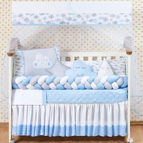 Protetor De Berço Nuvem 12 Peças Com Trança E Saia Box Azul Contém na embalagem: 1 edredom 1,30 m x 0,75 cm 1 almofada nuvem 0,40 cm x 0,20 cm 1 cabeceira 0,57 cm x 0,37 cm 1 lateral 1,25 m x 0,25 cm 1 trança 1,25 m x 0,12 cm 1 lençol de cima 1,30 m x 0,90 cm 1 fronha 0,28 cm x 0,38 cm 1 bandô de mosqueteiro 1,40 m x 0,20 cm 1 mosqueteiro 4,50 m x 1,50 m 1 almofada de gota 1 saia box 1,30 m x 0,70 cm. 1 almofada formato estrela; Observação: Kit de berço que serve em berços padrão nacional e americano Possui zíper para retirar os enchimentos Tecido de qualidade Composição: Tecido estampado: 100% algodão Tecido liso: 50% poliéster / 50% algodão Enchimento = 100% poliéster Mosquiteiro = 100% poliamida