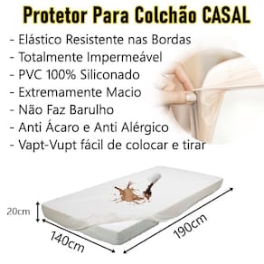 Protetor de colchão casal impermeável silicone + 2 fronha Neste kit conteúdo: 1 protetor casal com elastico cor bege. 2 fronha protetor de travesseiro O protetor para colchão siliconizado com elástico senior care, protege totalmente o colchão do suor, umidade e líquido, evita a proliferação de ácaros e fungos preservando o conforto e protegendo sua saúde. Ideal para incontinência urinária. Toque suave. Diferenciais: - não esquenta e não faz barulho; - antialérgico; - antiácaro; - lavável; - impermeável; - com elástico. Indicações - idosos - crianças - pne's portadores de necessidades especiais - incontinência urinária Tamanhos: Protetor casal 140 l x 190 c x 020 a cm Composição: confeccionado em plástico pvc 100% siliconizado com elástico de 14,5mm na borda, sistema vapt vupt . Fronha 70cm x 52cm. Composição: 100% pvc siliconado. com zipper lateral facilitando a colocação. cor: bege. Conteúdo: 1 protetor casal com elastico cor bege. 2 fronha protetor de travesseiro - o material é plástico Não, o material pela senior care na confecção do nosso modelo vapt vupt é o pvc siliconizado. - quando forrado por cima escorrega Depende muito do tecido, mas se for algodão não escorregará. - faz muito barulho Não, eles são confeccionados em pvc siliconizado além de dar um toque muito macio possibilita que o lençol seja extremamente silencioso. Marca: Não Informado Ean: 7896705500128