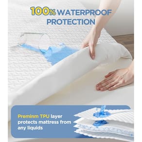 - 100% à prova d'água e inteligente para uso no bolso — O protetor de colchão impermeável Emircey Home é feito com material de poliuretano termoplástico de alta qualidade que bloqueia líquidos, poeira e manchas com eficácia, protegendo seu precioso colchão. Seja a enurese de uma criança na cama ou um acidente com um animal de estimação, nossa capa de colchão tem o que você precisa. Mesmo após 500 lavagens, a camada impermeável de TPU atualizada ainda funciona bem, mantendo seu colchão fresco e limpo por anos. Um investimento inteligente, valor de longo prazo com o qual você pode contar!