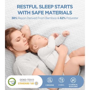 - SONO SEGURO E NOITES DE DESCANSO — Certificada pela OEKO-TEX Standard 100, nossa colcha é feita de 38% de rayon derivado de bambu e 62% de poliéster, garantindo que seja hipoalergênica, inodora e livre de substâncias químicas nocivas, como água sanitária, vinil e benzeno. Portanto, é ideal para famílias com crianças, animais de estimação ou idosos. A viscose de bambu mantém sua roupa de cama confortável e seca, absorvendo a umidade e os odores. Desfrute de uma superfície de dormir hipoalergênica para uma noite de sono mais limpa e melhor - para você e sua família.