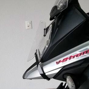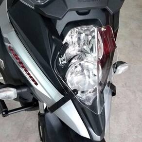 Protetor de farol em aço carbono com pintura epóxi preto fosco, lente em acrílico transparente de 3mm, resistente a impactos e radiação UV. Design exclusivo para V-Strom 650A/XT 19/25.Vendido por Mx Parts e entregue por Casas Bahia