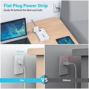 - Plugue plano: o design que economiza espaço do plugue plano permite que o cabo de alimentação fique perto da parede para que possa ser facilmente escondido na parte traseira dos móveis e não bloqueie o receptáculo inferior