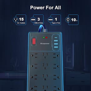 ?Cabo de extensão preto 19 em 1 com várias tomadas?- Conector plano de régua de alimentação Com 15 tomadas CA e 4 portas USB(1 porta USB C), este filtro de alimentação USB pode carregar até 19 dispositivos simultaneamente com não mais que 1875 W/15 A. O chip IC inteligente integrado se ajusta automaticamente e fornece a velocidade de carregamento ideal para seus dispositivos eletrônicos com saída de alimentação USB de até 2,4A/porta, porta USB C MAX 5V/3A, 20W no total.