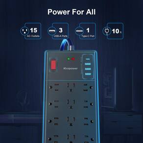 ?Cabo de extensão preto 19 em 1 com várias tomadas?- Conector plano de régua de alimentação Com 15 tomadas CA e 4 portas USB(1 porta USB C), este filtro de alimentação USB pode carregar até 19 dispositivos simultaneamente com não mais que 1875 W/15 A. O chip IC inteligente integrado se ajusta automaticamente e fornece a velocidade de carregamento ideal para seus dispositivos eletrônicos com saída de alimentação USB de até 2,4A/porta, porta USB C MAX 5V/3A, 20W no total.