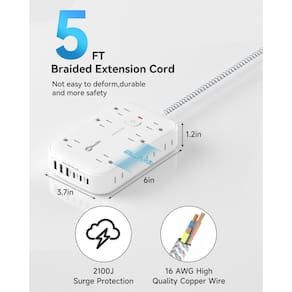 - Montável na parede e com cabo de extensão de plugue plano ultrafino: 2 orifícios de montagem na parte traseira podem facilmente garantir o protetor contra sobretensão em paredes, rodapés ou móveis. O plugue plano possui um perfil baixo que se encaixa facilmente em espaços apertados e fica escondido atrás de móveis. 5 pés de borracha na parte inferior evitam que ele escorregue e deslize. O cabo plano 16AWG de 5 pés é feito de cobre puro, que tem melhor capacidade de transporte de corrente (13A). O cabo de alimentação de tecido trançado não é fácil de deformar, é durável e mais seguro