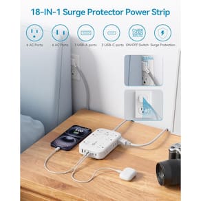 - Design de 3 lados e fonte de alimentação com interruptor: 12 tomadas AC são distribuídas em três lados, para que os adaptadores de alimentação não interfiram entre si. O cabo de extensão de alta potência converte uma tomada de parede padrão em seis tomadas de 3 pinos, seis tomadas de 2 pinos, 6 portas USB (3 USB-C) com um interruptor de sobrecarga. O cabo de extensão com interruptor é conveniente para desligar rapidamente a alimentação sem precisar conectar e desconectar constantemente o cabo de alimentação da parede