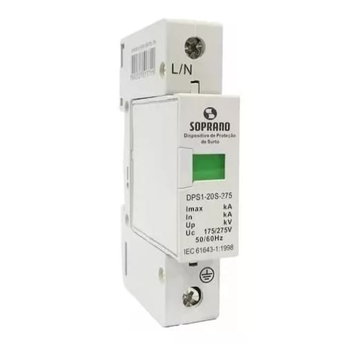 Protetor De Surto 20KA DPS Unipolar 275V Classe 2 Soprano Os dispositivos de proteção contra surtos (DPS) são aplicados para evitar sobretensão causada por descargas atmosféricas (raios) ou manobras de concessionárias. Os dispositivos de proteção contra surto (DPS) são instalados nos quadros de distribuição, ou no padrão de entrada juntamente com disjuntores.CARACTERÍSTICAS: Norma Técnica: IEC 61643-1:2007Nº de Polos: 1Classe: Classe IIGrau de Proteção: IP20Tensão Nominal – Um: 220VacTensão de Operação – Uc: 275VacNível de Proteção de Tensão – Up: <1.0kVIndicações de Operações: Verde (Operação) e Vermelho (Fora de Operação)Corrente Nominal de Descarga (8/20us) – In: 10kACorrente Máxima de Descarga (8/20us) – Imax: 20kATempo de Resposta – Ta: <25nsConectores p/ Cabos: 50mm²Temperatura de Aplicação: -40° ~+80°C Fabricante: SOPRANOUnidade: 1 peça Connecting lives